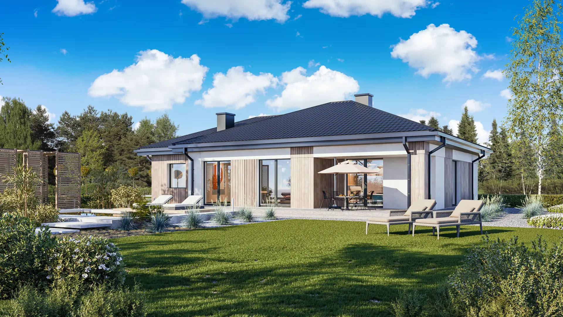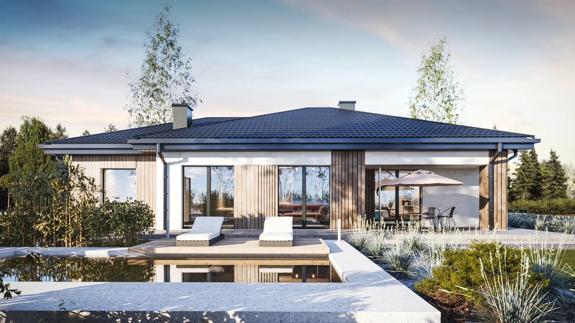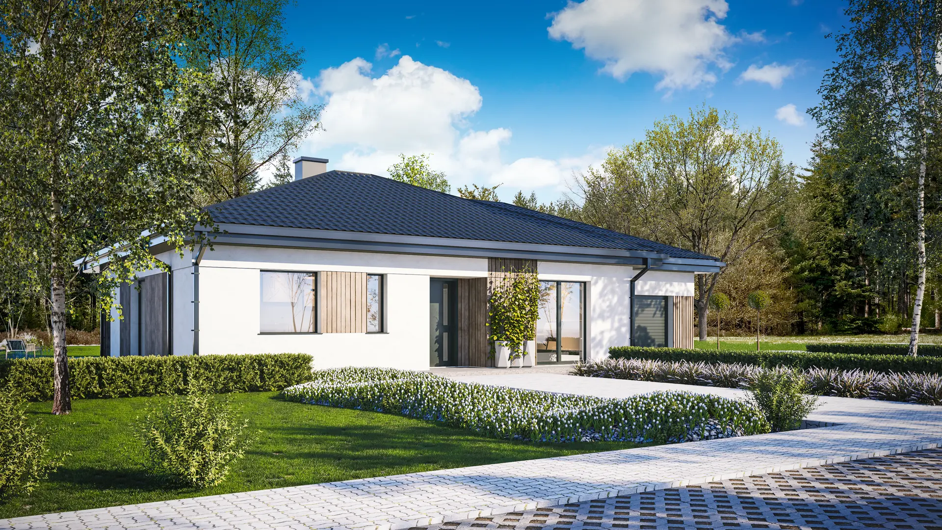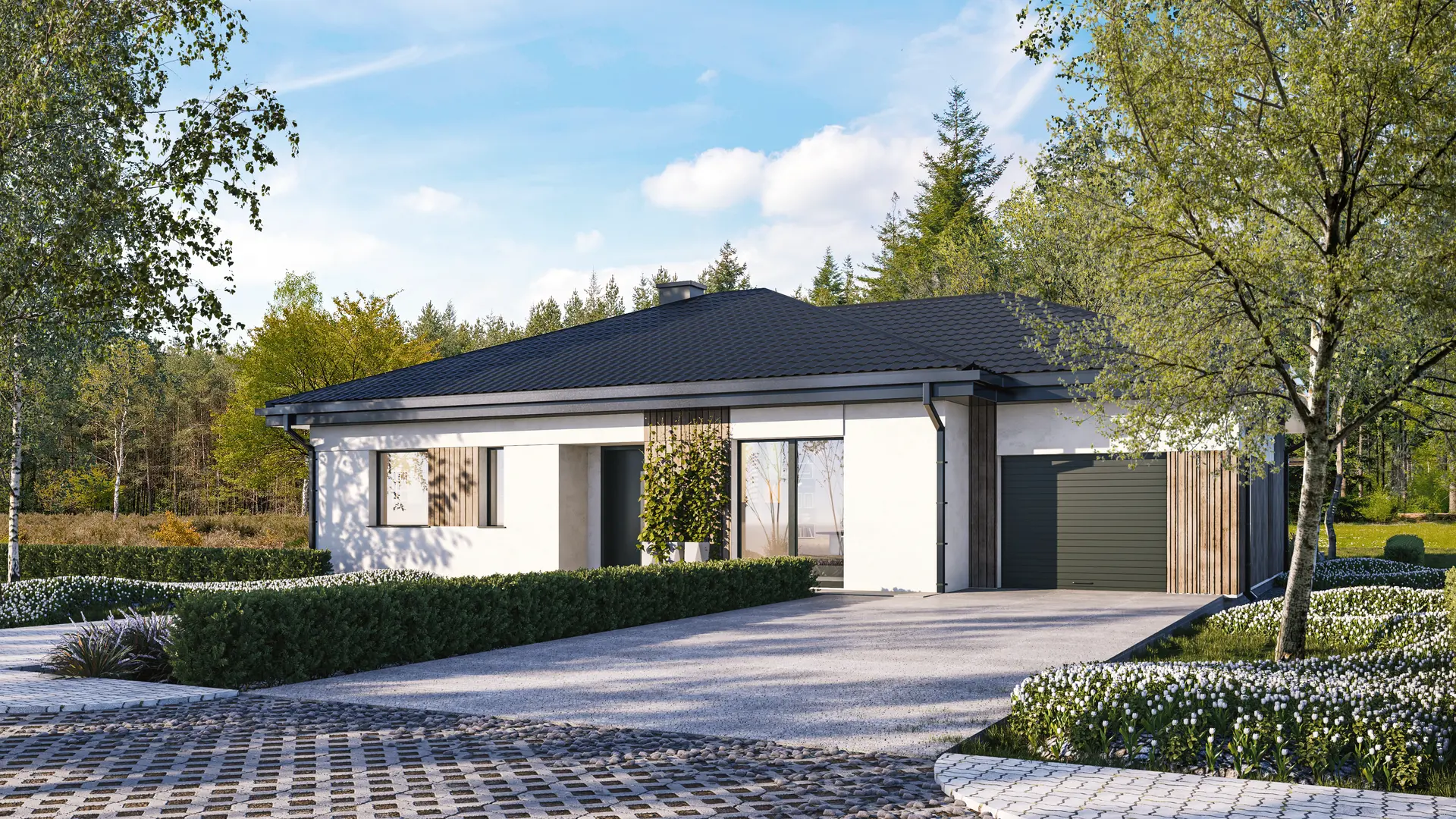 DOM 105+22m² – Dom parterowy z trzema sypialniami przykryty dachem wielospadowym z garażem