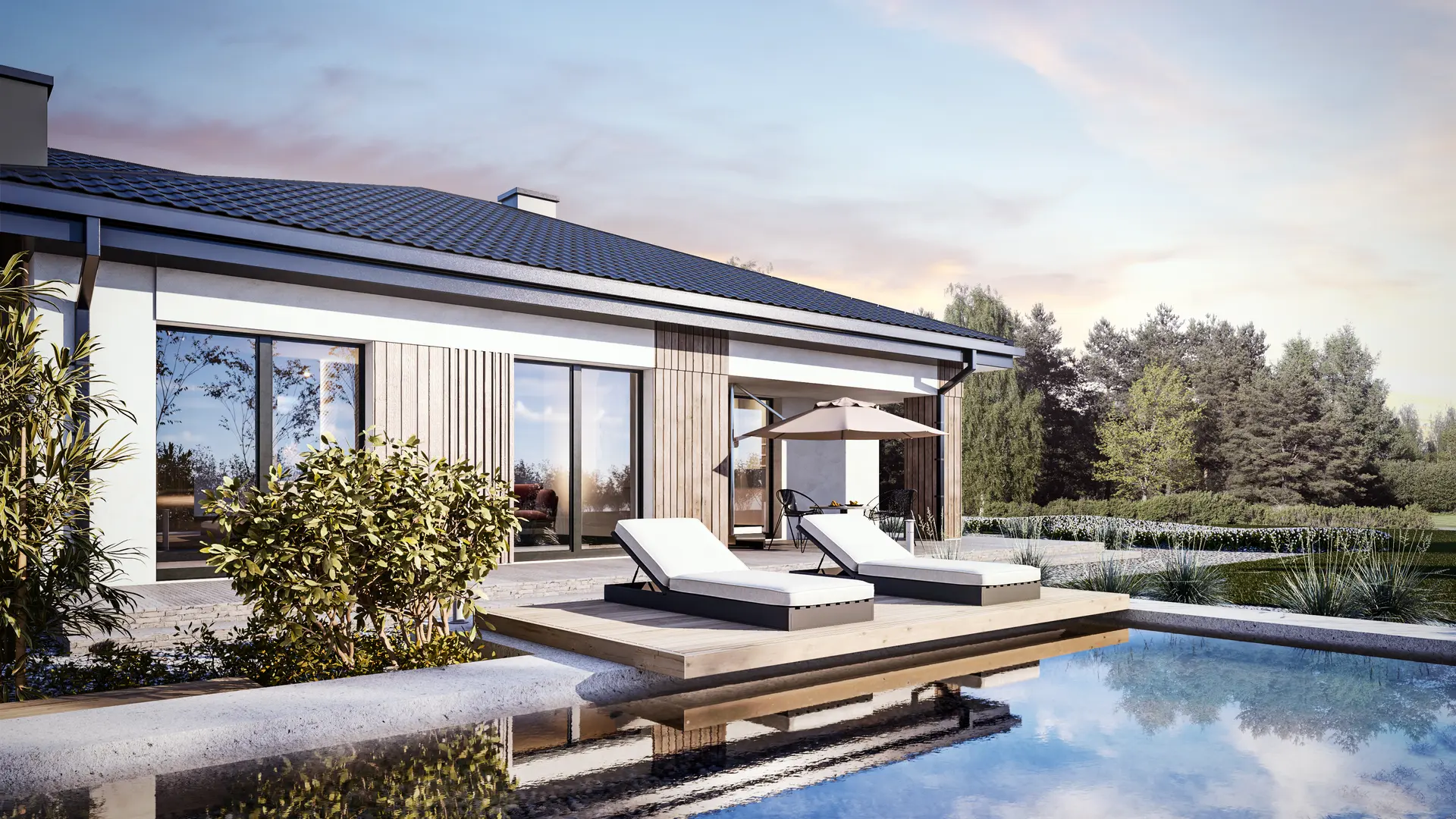 • Basen 4×8 m z kompletną instalacją wraz z pompą w opcji (standard dla domów od 240 m²).